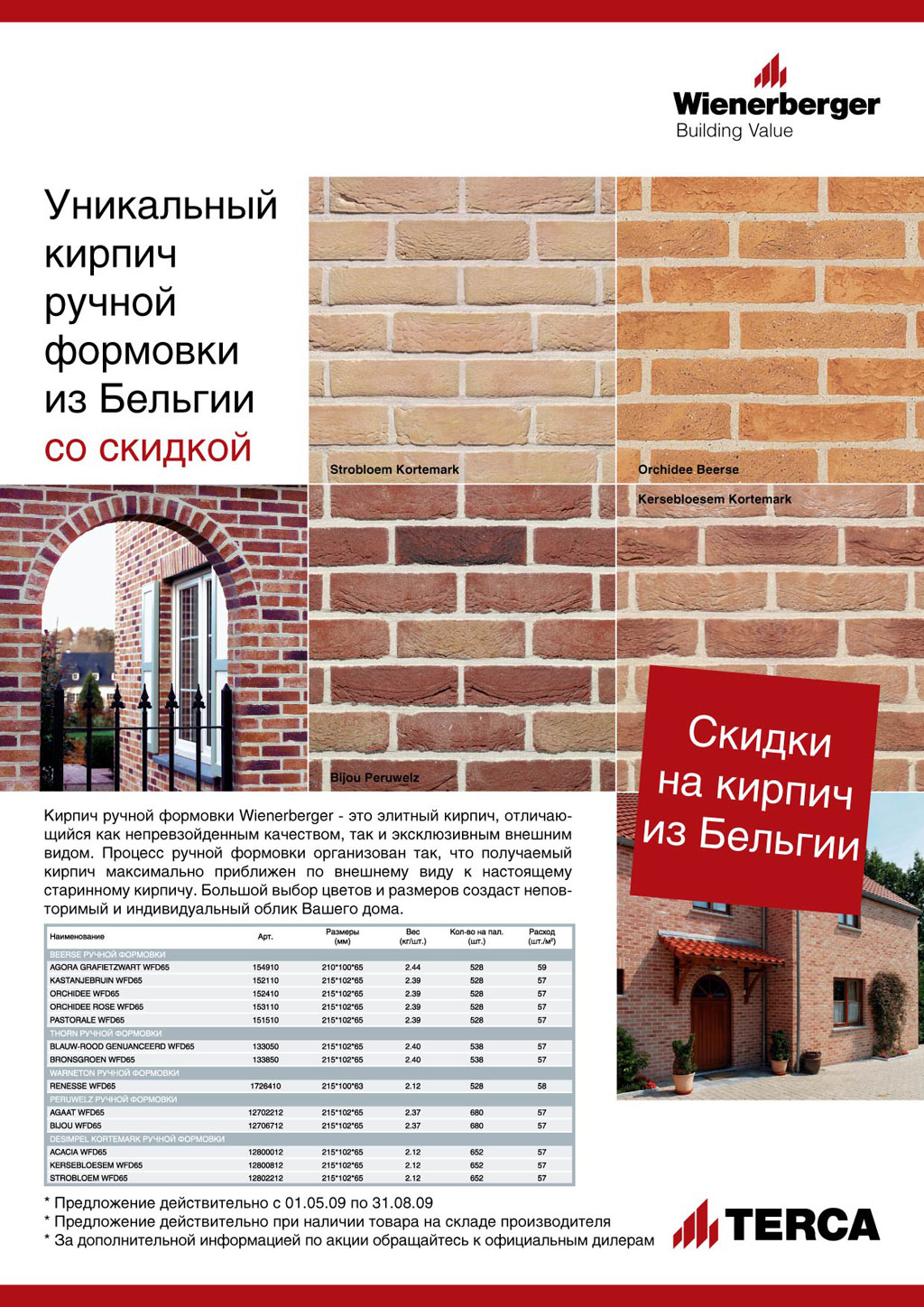 В период с 01 мая по 31 августа 2009 г. в торговой сети «ТОП ХАУС — Лучшее для загородного дома» действует скидка 15% на бельгийский кирпич «Terca» ручной формовки: