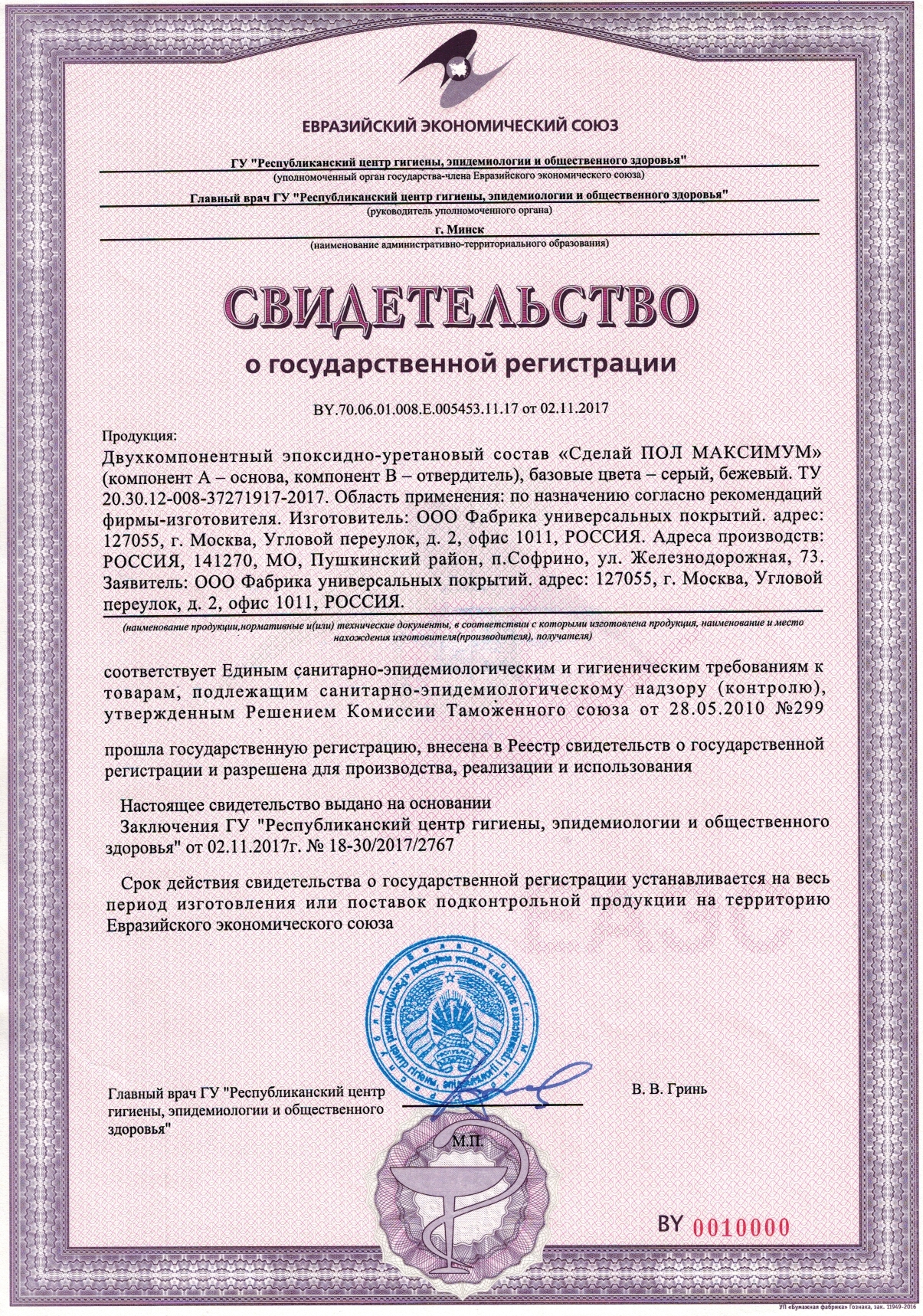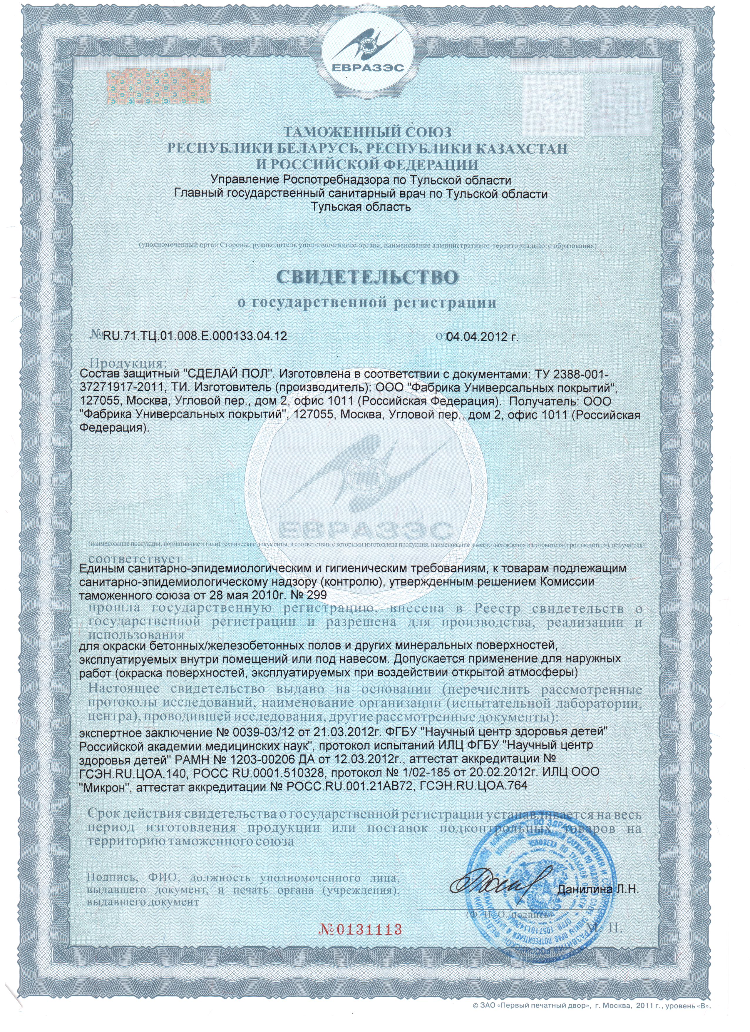 - Свидетельство гигиена Укрепляющий